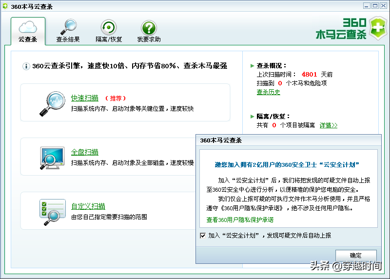 360安全卫士里面还有一个木马云查杀,进去之后也有快速扫描、全盘扫描、自定义扫描可以选择,看看左上角显示的:“上次扫描时间:4801天前”