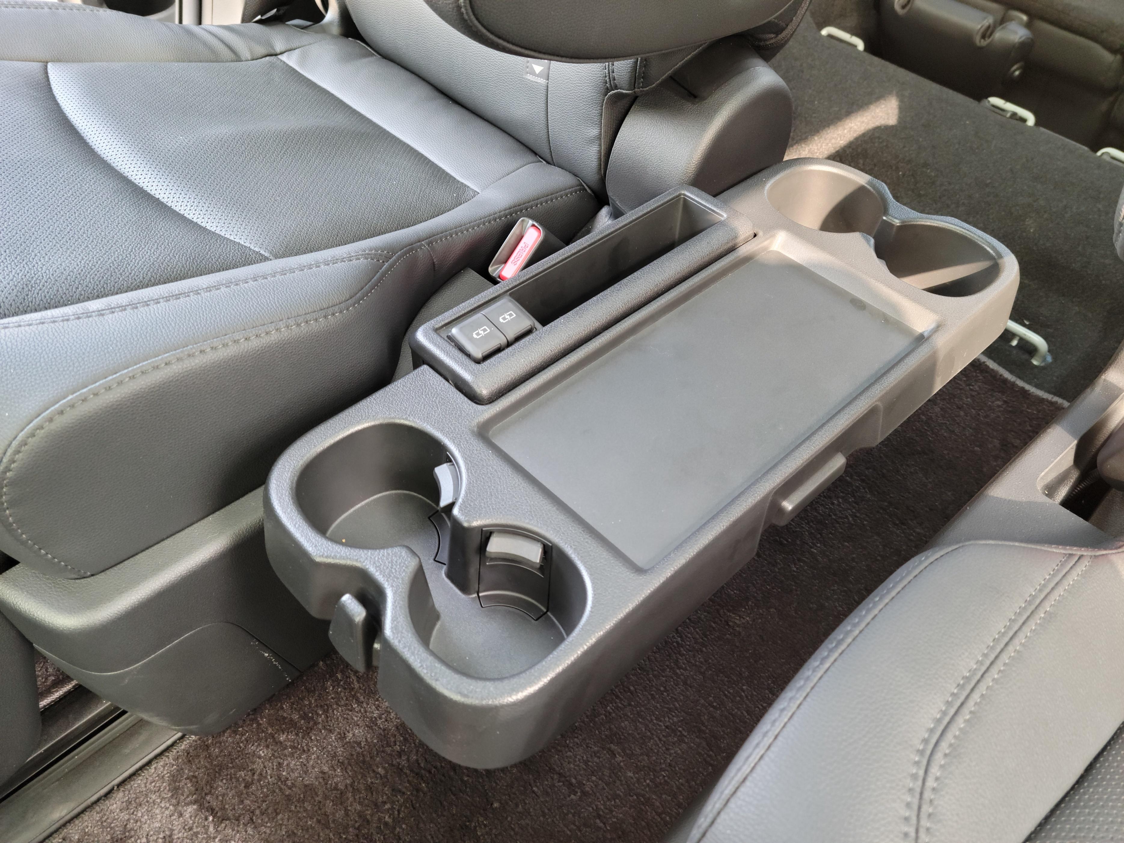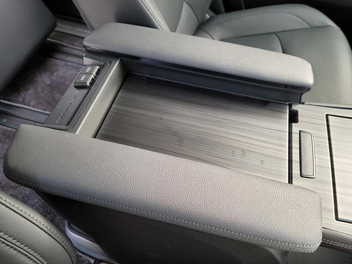 接下来是第二排,前方区域除了杯架和一些电源接口,在两个独立座椅中间,还设计了一个可折叠的储物板,上面除了杯架,还可以放各种小物件,包括手机,细节方面还有两个电源接口以及两个挂钩,对于第二排乘员的储物需求,那是很到位。