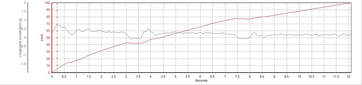 关闭ESP,踩下离合器挂到一档将转速憋到2000转,抬起离合器因为地滑S3随着刺耳的挠胎声窜了出去,整车在一二档加速非常迅猛因为是手动车型,但是在换到三挡时速度就开始缓慢的爬升,实测该车的百公里加速成绩为12.13秒如图所示该车的最大G值为0.73。