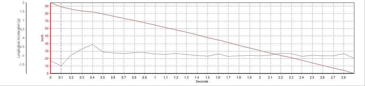 全力制动时该车点头较为明显,abs在制动初段迅速介入后,制动力回调同时最大G值为1.556,也是出现在制动初段,整体制动过程较为平顺。