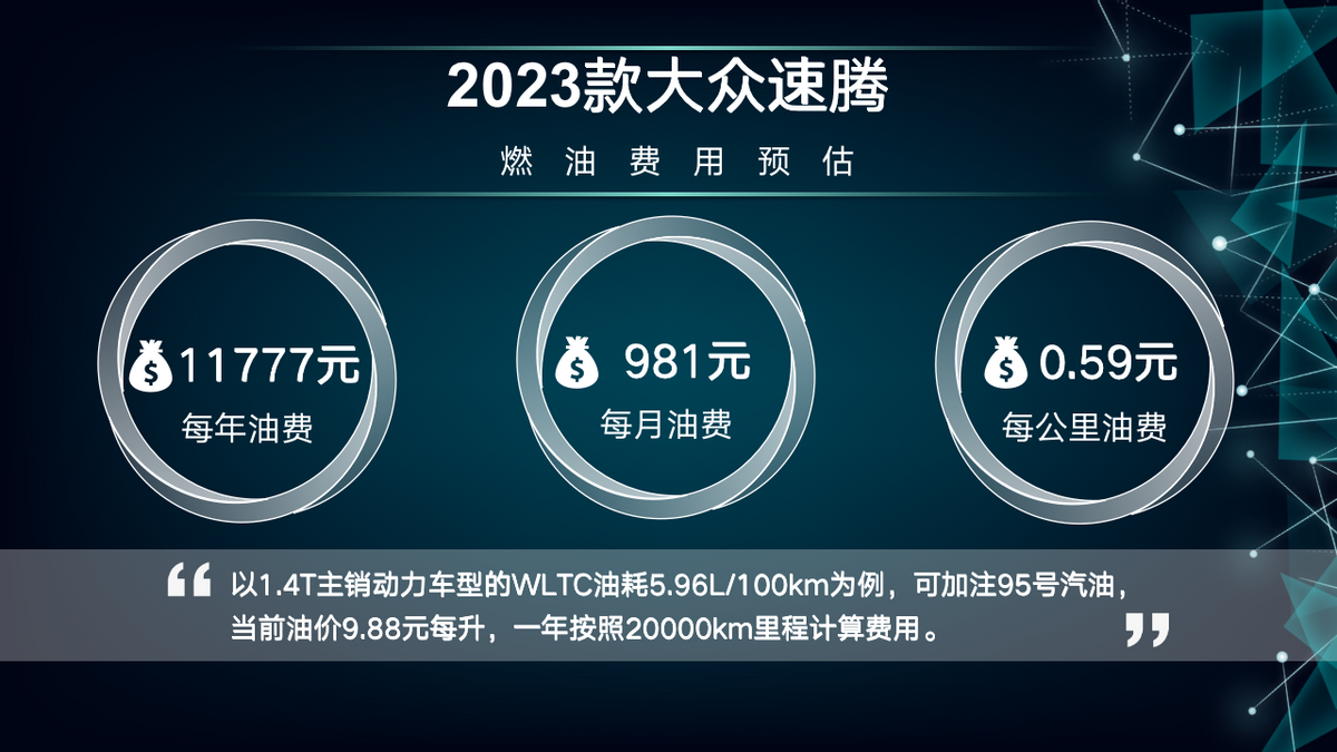 燃油费用方面,我们以新款速腾搭载的1.4T主销动力来计算燃油成本,可加注95号汽油,当前油价每升9.88元,新速腾1.4T主销动力的WLTC油耗5.96L/100km,一年按照2万公里里程计算费用,可以算出速腾一年的燃油费用是11777元。