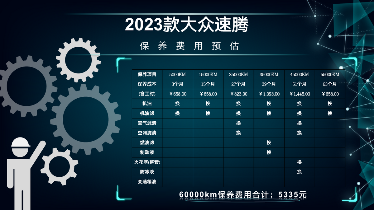 供大家参考,像首保更换机油、机滤这样简单的项目,新款速腾加上工时费为658元。我们大致计算了一下,60000km的总保养费用是5335元,按照一年20000公里计算,每年保养花费约为1778元,属于中等水平。