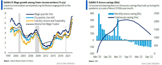 解析:对于美国消费者来说,通货膨胀和劳动力市场正在进行一场拉锯战。食品和能源通胀对低收入家庭来说尤其具有挑战性,他们收入的很大一部分得用于生活必需品的消费,他们同时也经历着强劲的就业增长和最快的工资通胀,这抵消了通胀带来的一些痛苦,并使消费者支出保持相对弹性。