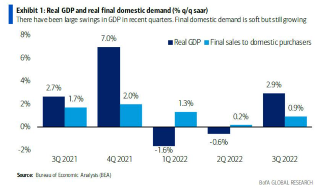 技术性衰退通常与NBER的衰退定义一致,但今年的情况有所不同,因为 GDP 已被进出口和库存数据的大幅波动所扭曲。基于此,当排除这些造成干扰的因素,就会发现,尽管最终需求指标(消费者支出、住宅和商业投资以及政府支出)已显示出疲软,但仍在增长。