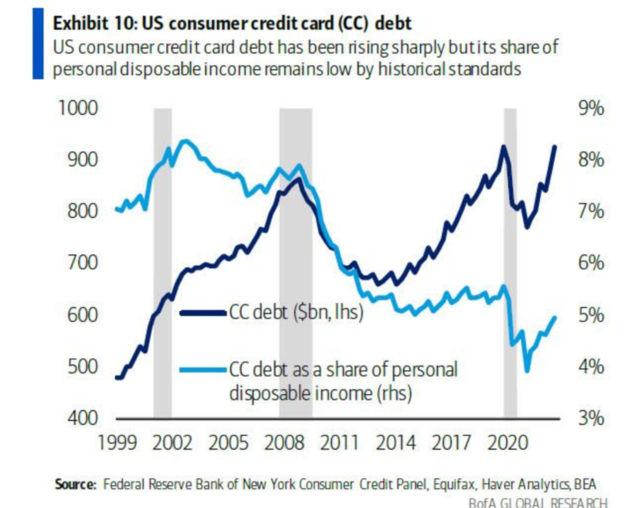 解析:信用卡债务已从去年年初的不到 8000 亿美元增加到 2022 年第三季度的 9250 亿美元,这个增长速度令市场震惊。可能是因为消费者流动性限制和利率上升共同作用的。信用卡债务水平已经接近历史最高水平。