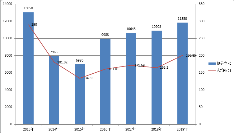为了直观地反映2013-2019年中国女子网球单打水平情况,我将每年年末的总积分和人均积分绘制成如下这张图,以便清晰地进行比较和观察。