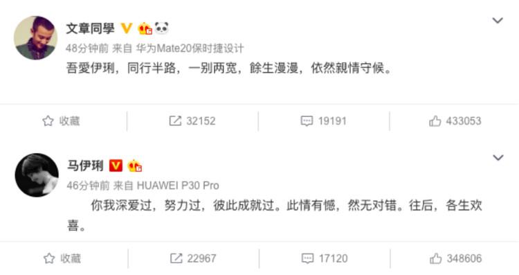 马伊琍在微博上面表示“你我深爱过,努力过,彼此成就过。此情有憾,然无对错。往后,各生欢喜”。不仅如此,文章也发了一条微博,表示吾愛伊琍,同行半路,一别两宽,餘生漫漫,依然親情守候。