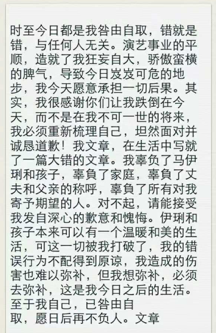 早知道,马伊琍和文章结婚之后,为了文章,为了这个家庭付出了多少。一个女人,不仅要顾着事业,还要顾着家庭,几乎全部的压力都背在她的身上。而她的丈夫不仅不给马伊琍安慰和支持,反而还出轨。当时,文章被曝光出轨事件之后,看到证据确凿,也没有再狡辩,而是直接在微博上面发布了道歉信。表示自己是“咎由自取”,辜负了家庭,也辜负了丈夫和父亲的称呼。不过因为这封道歉信里面“辜负”两个人的写法不一样,而被记者怀疑是代笔。