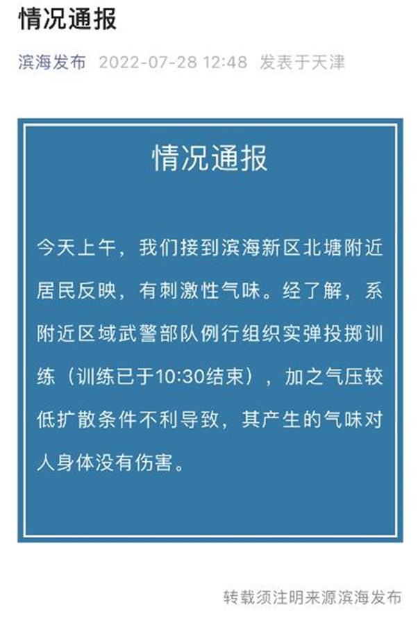 当日中午12时48分,“滨海发布”发布官方通报:今天上午,我们接到滨海新区北塘附近居民反映,有刺激性气味。经了解,系附近区域武警部队例行组织实弹投掷训练(训练已于10:30结束),加之气压较低扩散条件不利导致,其产生的气味对人身体没有伤害。
