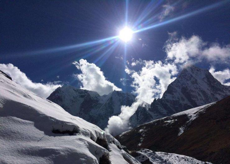 每一个前往珠峰的人都是激动不已的,即使我们在临行前都会反反复复的劝慰自己要淡定,要沉住气,不要因为心情的过于激动导致生理上出现对高原的不良反应。但是,当你从318国道下来,进入定日县境内后,眼前群山重重的景象纷沓而至,我想任谁都无法再伪装下去。望天望云望远山,汹涌壮阔的峰头由远及近,车窗外的一切景色都被笼罩在灿烂的阳光之下,远处的山尖也因为阳光的照耀变得模糊不清让人眼前眩晕。