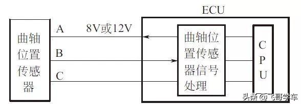 曲轴位置传感器与发动机电子控制单元(ECU)之间用3根导线相连接,如下图所示。一根是传感器的电源线A;另一根是传感器的输出信号线B;还有一根是传感器的接地线(即搭铁线)C。