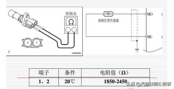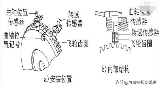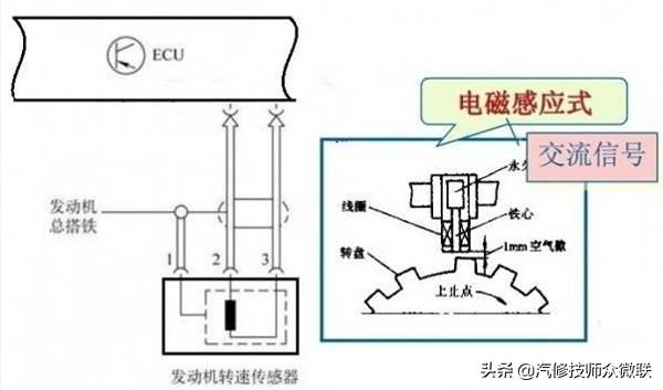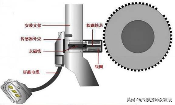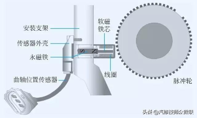 其中,电磁感应式曲轴位置传感器安装在曲轴前部,中部,飞轮外壳上。其结构图和线路图如下: