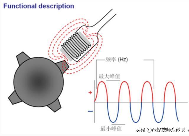 电磁感应原理 永磁体和信号盘形成磁场回路。信号盘转动切割磁场 线圈感应电压 输出信号给发动机电脑
