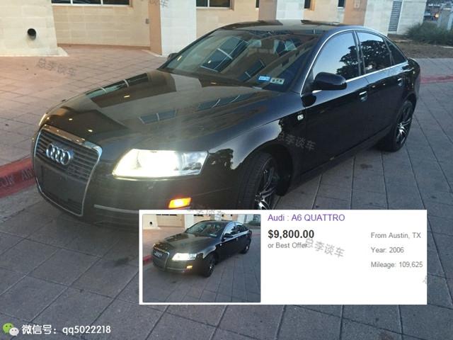 这是一辆2006年的奥迪A6(3.2L)九年的车龄行驶里程109625,价格为9800美元,相当于凤姐年收入的1/3,4驱带天窗 ,真皮电动座椅,CD,ABS,巡航定速,配置不低吧?买这样的车对凤姐来说压力小很多!凤姐步入有车一族并不难!慢慢的有点佩服了!