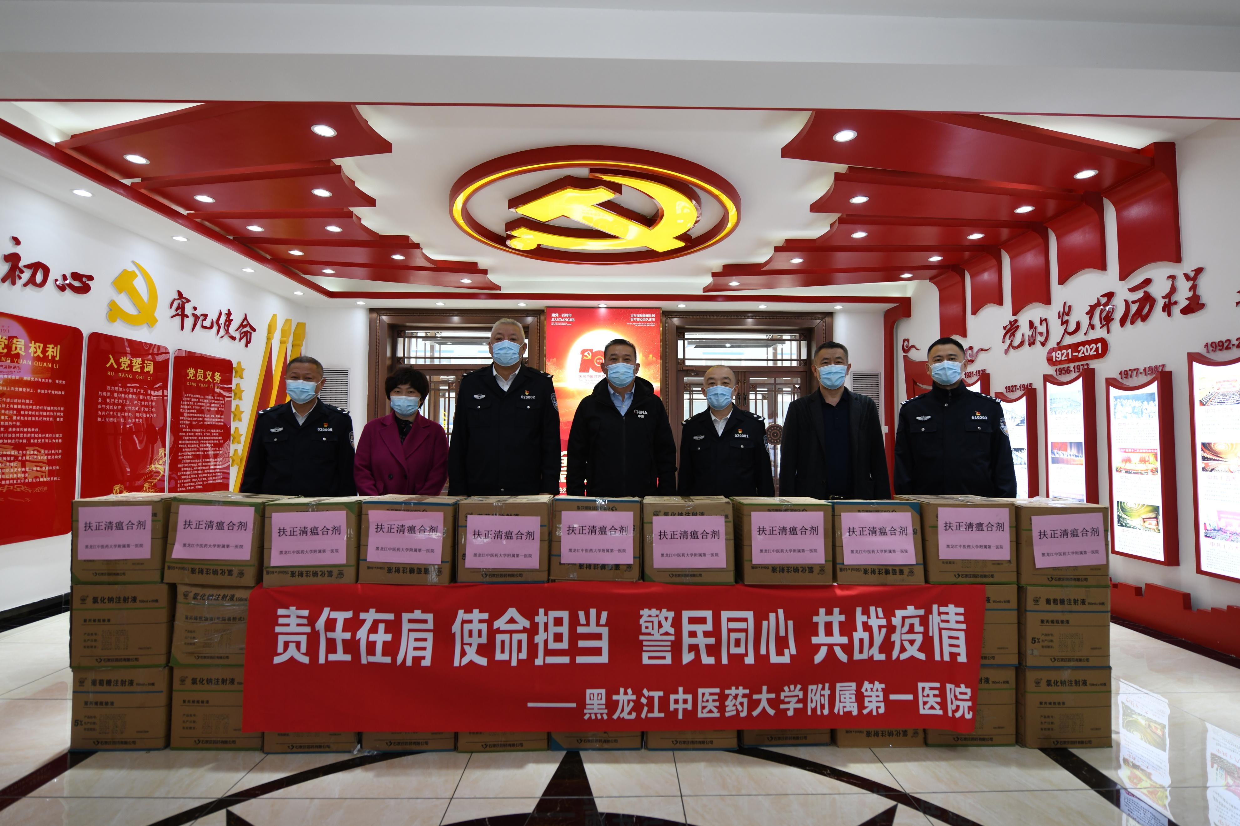 4月23日上午,黑龙江中医药大学附属第一医院党委书记邢国利、工会主席任为民、医务科科长王珏、保卫科科长高英迪一行到我局慰问,为奋战在抗“疫”一线的民警、辅警送来防疫药品。副区长、分局党组书记、局长肖景涛,分局党组副书记、政委李长涛,党组成员、政治处主任周嘉琳接待来访客人,并代表分局接受捐赠。