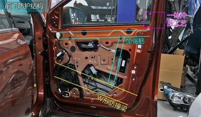 门板的整体性很强,采用一体冲压式,内部采用弓形防撞梁(比市面上多用的圆形钢管支撑性更好)除了防撞梁在夹层中还有两层加强筋,最大程度上保证了车门的坚固,碰撞时让车门不易变形,好打开车门帮助成员逃生(四个门都如此)