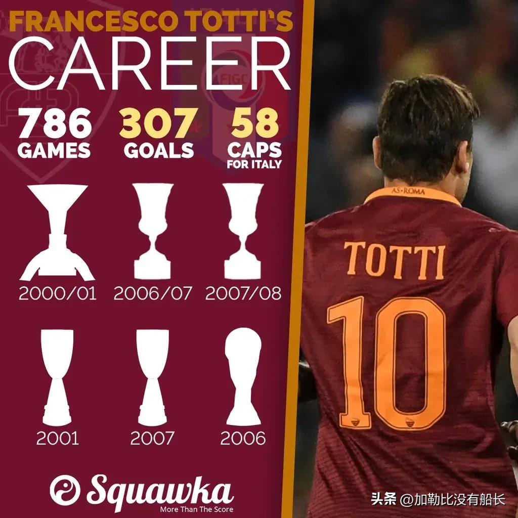 虽然托蒂职业生涯中没有拿过欧冠、也没有金球奖与世界足球先生,但他也有与蓝衣军团登顶世界之巅的辉煌时刻,而在世纪之交,与从紫百合转投而来的战胜巴蒂,一起为罗马拿到了迄今为止俱乐部最后一座联赛冠军奖杯,作为效力球队24载春秋的不老传奇,当他决定在2017年正式决定退役的那一刻, 狼王早已成为这座古老城市永远的罗马王子了 。
