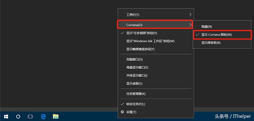 如果没有在任务栏上显示Cortana,可以在任务栏空白处右键后用以下方式设置显示或隐藏。