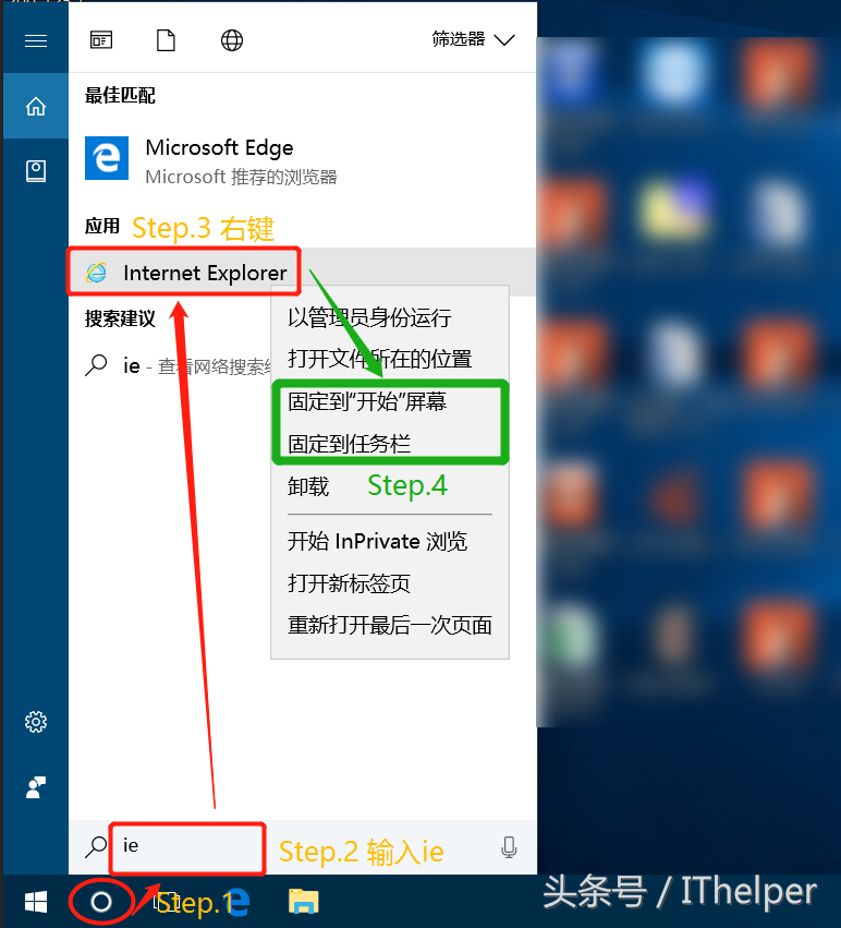 三、在任务栏上找到Cortana(微软小娜),在底部搜索框里面输入“ie”,在搜索结果里面可以看到IE,右键它就可以把它固定到开始“”屏幕或任务栏了;