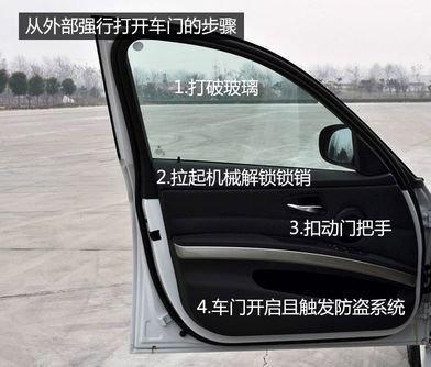 机械钥匙打不开车门一般就是门锁坏了,其他情况下机械钥匙都是可以开门的,注意机械钥匙的使用方法就好。如果是门锁坏了,请打电话找4S店或者专业的维修厂前来救援。若车内有重要物品,不得不开门的话,那就只好破窗而入了。具体的操作过程请看下图: