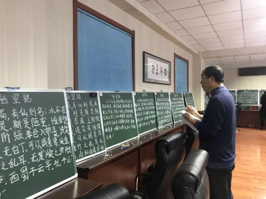 比赛分为钢笔字、粉笔字、板书设计三部分,共有54名教龄在10年以下的青年教师参赛。赛前,参赛教师通过抽签确定了选手编号,并自行选材完成了板书设计。54名选手现场进行了钢笔字、粉笔字的展示。赛场上,青年教师们个个精神饱满,专注认真,一笔一划,一丝不苟。15分钟内,一幅幅或行云流水,或刚劲有力,或清秀俊雅的作品就呈现出来,充分展现了青年教师们的书写风采。