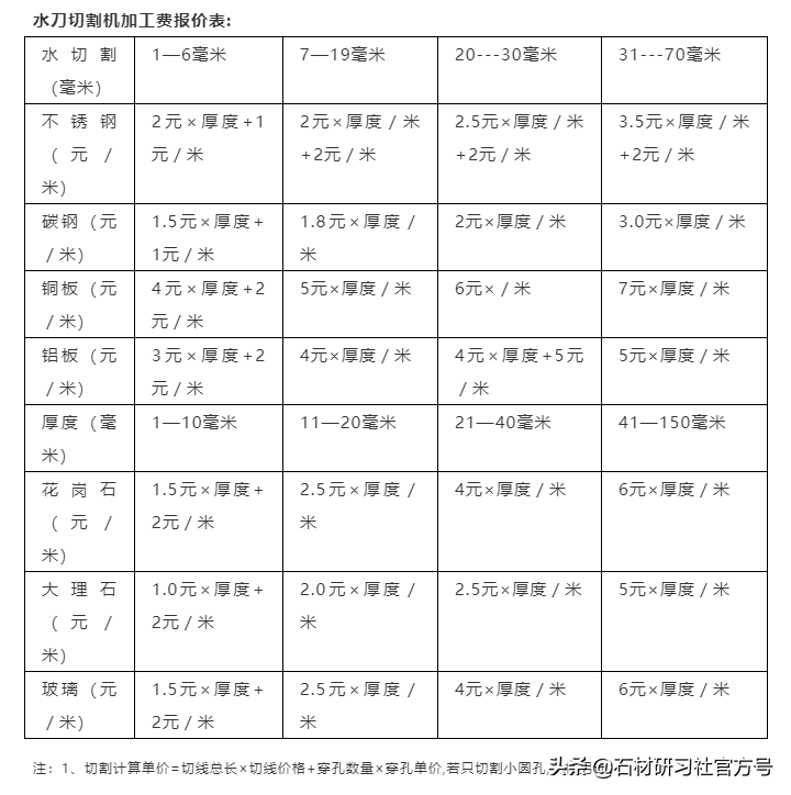 用水刀做石材加工切割:专业做水刀拼花,拼图,腰线,波导线,地脚线,加工切割异形,圆弧,切角,价格一般收费是多少?腰线一般加工费是50元左右每条,不连材料(瓷砖)也要看图案而定的,切角5元每个,切直线或一开四等一般价格是12元每米来计算的,拼图要看图案而定复杂的要贵点,一般价格在450元-1500元每平方之间,花岗岩两种石材拼花水刀切割,25mm厚,报价30元每米或300元每平方,一般看图案的复杂度的,不复杂的,直来直去的走刀,厂家跟你按米算,大家都清楚明了,图案复杂的,做个造型,描个花啊草的,当然就按平方来算,看每个加工厂家自己的定位。