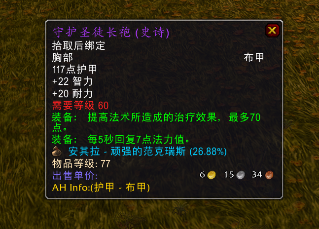 起初的时候笔者并不知道这件装备,因为对于顽强的范克瑞斯这个BOSS来说,只要不出咸鱼剑它就是黑了。包括两件其拉武器都出,也没有咸鱼剑一把卖得高,这是个不争的事实。守护圣徒长袍也是这个BOSS掉落的,笔者第一次见这件装备的时候,是笔者公会的一个玩家买的,当时花了2500金买的。
