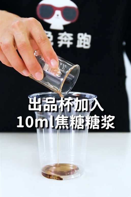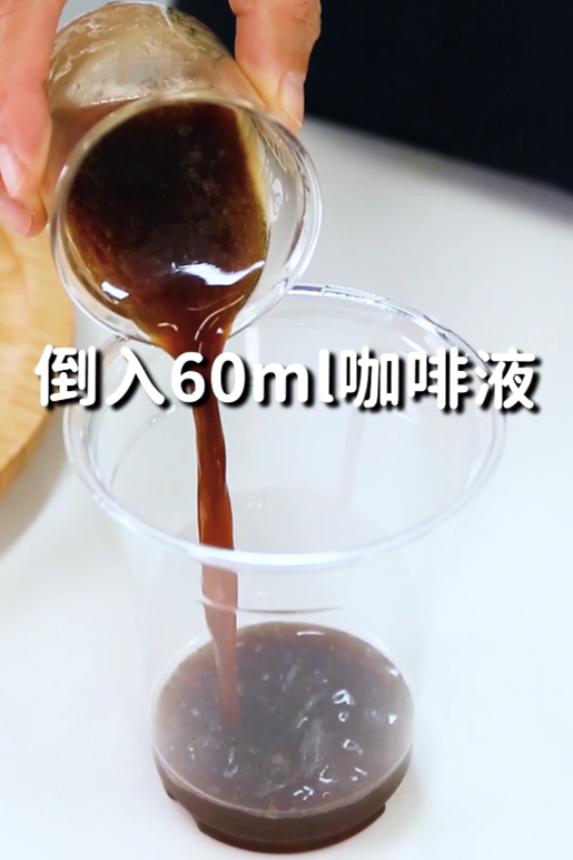 第3步:另外在出品杯中加入10ml焦糖糖浆、60ml咖啡液备用