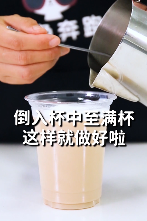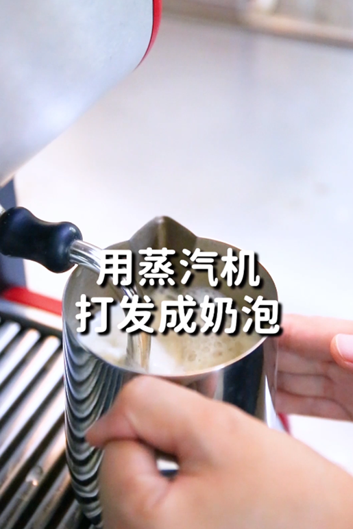 第4步:接下来在加热杯中加入200ml牛奶,用蒸汽机将牛奶打发成奶泡,然后倒入出品杯中至满杯,这款饮品就做好啦