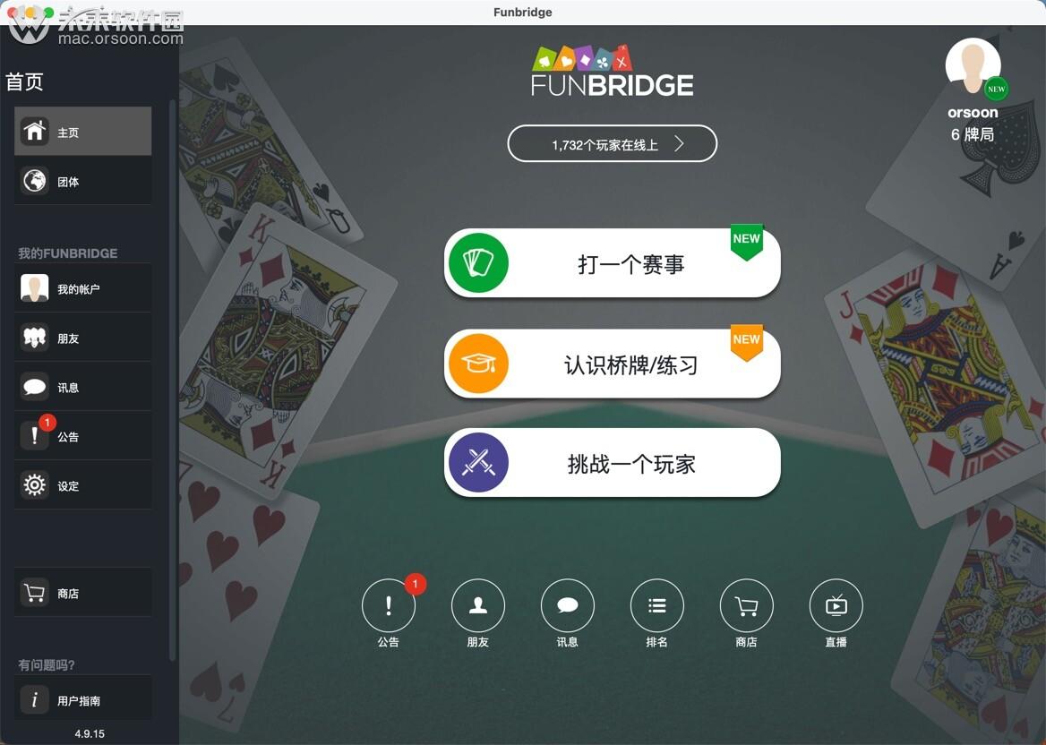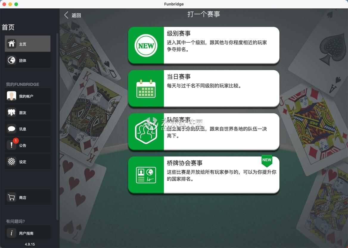 FunBridge for Mac 是一款运行在Mac平台上的棋牌游戏,你可以通过桥牌俱乐部 Mac版和各地的玩家一起玩桥牌,不同难度的游戏模式自由选择,无需等待,桥牌俱乐部for Mac让你随时都能开始牌局。