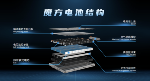 以“卧”字为例,魔方电池采用的是电芯躺式布置的方式,能够最大限度地减少相邻两颗电芯之间热失控的传导路径,确保单个电芯热失控不会发生骨牌效应。同时躺式布置,电芯的防爆阀朝向两侧,能够天然降低电芯热失控时物质喷发时的伤害。