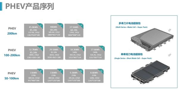 而在混动汽车(DM)领域,受限于汽车电池空间,电池包目前主要以短刀电芯为主,并有单串刀片电池超级包和多串刀片电池超级包等不同组合形式,可以满足混动汽车在纯电的情况下实现50—250KM的续航要求。