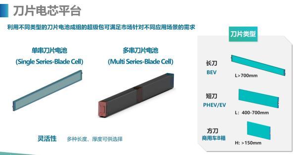 据介绍,弗迪电池已经形成了刀片电芯平台,刀片电芯根据形状可分为长刀(长度大于700 mm)、短刀(长度400-700 mm)、方刀(高度大于150 mm),利用不同类型的刀片电池成组的电池包可满足不同车型的空间要求和电压要求。