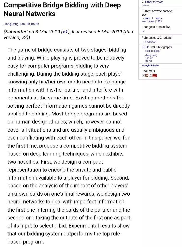 而在今年 AAMAS 2019 的 140 篇入选论文中,我们注意到,其中有一篇关于不完全信息博弈游戏——桥牌游戏的论文——《Competitive Bridge Bidding with Deep Neural Networks》。该论文的作者是中科院计算所博士生荣江(现在阿里巴巴工作)、微软亚洲研究院资深研究员秦涛博士、新加坡南洋理工大学计算机科学与工程学院安波博士。