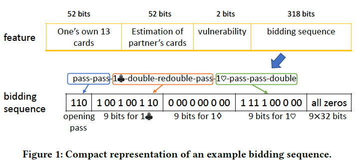 我们用到的特征包括完全信息和不完全信息两部分,其中完全信息包括自己的牌、局况(vulnerability)、叫牌序列(bidding history),不完全信息包括对队友牌的预测。