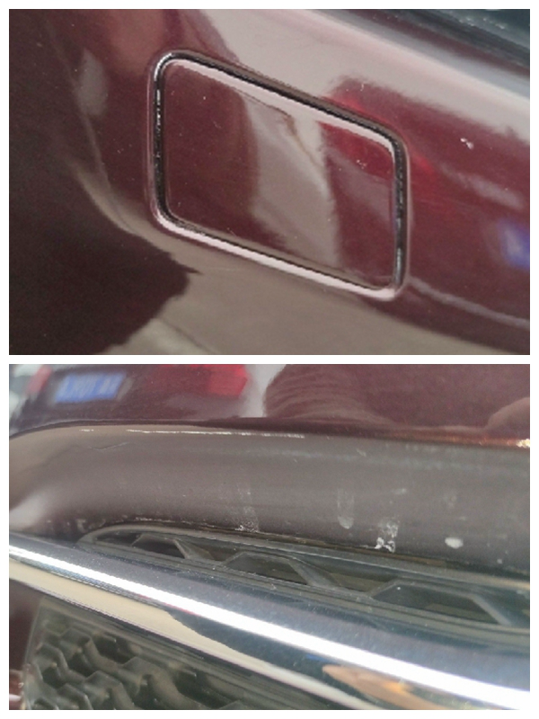 开始看车,既然行人保护装置都弹了,那么前边肯定有过碰撞!观察前保险杠有后喷漆的痕迹,边缘还有飞漆残留!