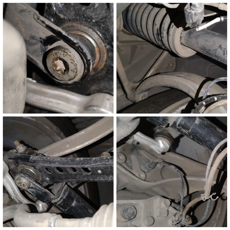 前轮减震、摆臂都拆装更换了,看底盘并没有严重托底的痕迹,所以应该是老化更换,这也侧面说明公里数的不实!换了也好,客户买回去不用整备这些了!