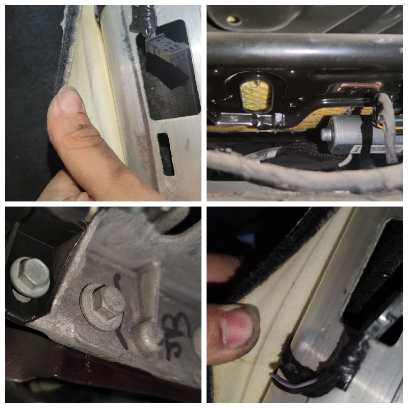 值得注意的是,左边C柱内侧也有钣金喷漆,拆开胶条查看门框封边,还好没有切割的痕迹,应该只是叶子板带着C柱变形了,后做了修复!