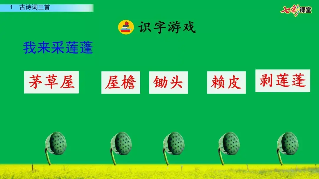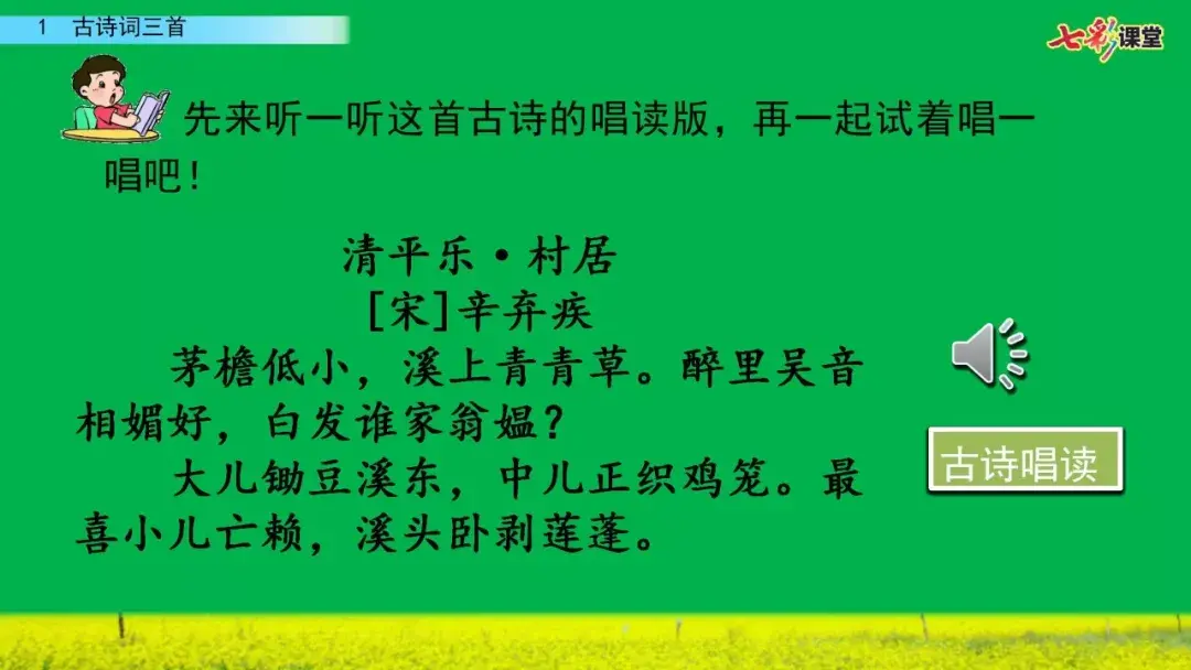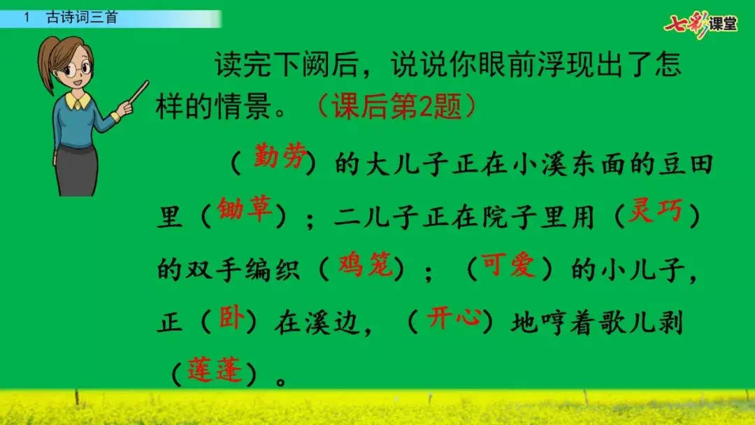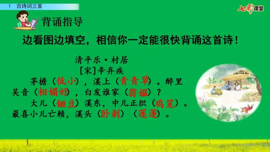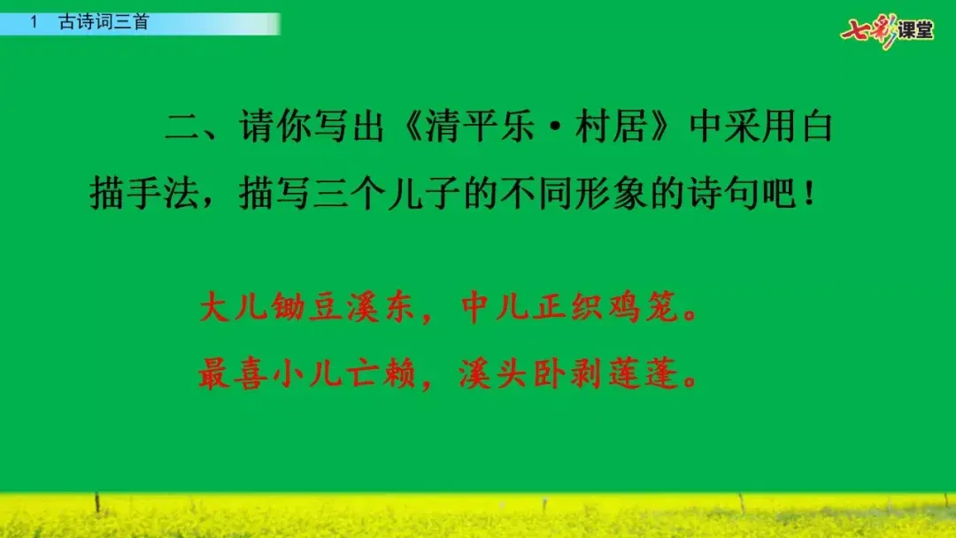 诗意:大儿子在溪东边的豆田锄草,二儿子正忙于编织鸡笼。最令人喜爱的是小儿子,他正横卧在溪头草丛,剥着刚摘下的莲蓬。