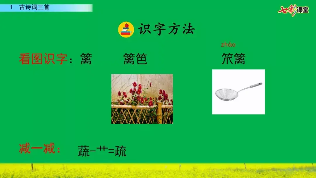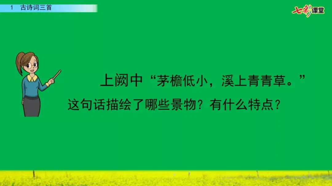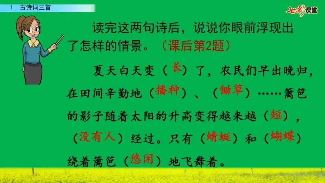 场景:夏天白天变长了,正午时分,太阳高高在上,农民们早出晚归,在田间辛勤地播种、锄草……篱笆影子随着太阳升高越来越短,路上没有人经过。四周静悄悄的,只有蜻蜓和蝴蝶飞过。