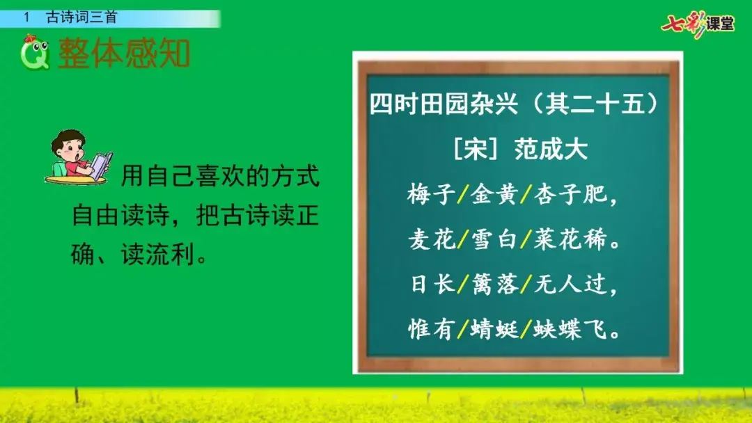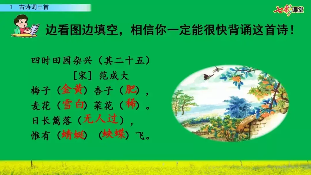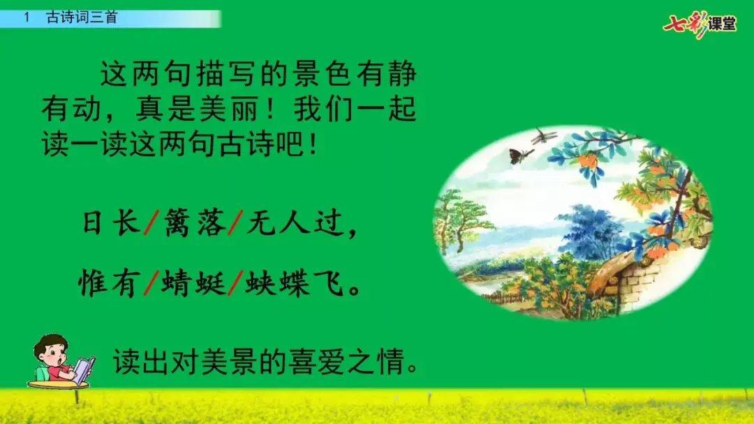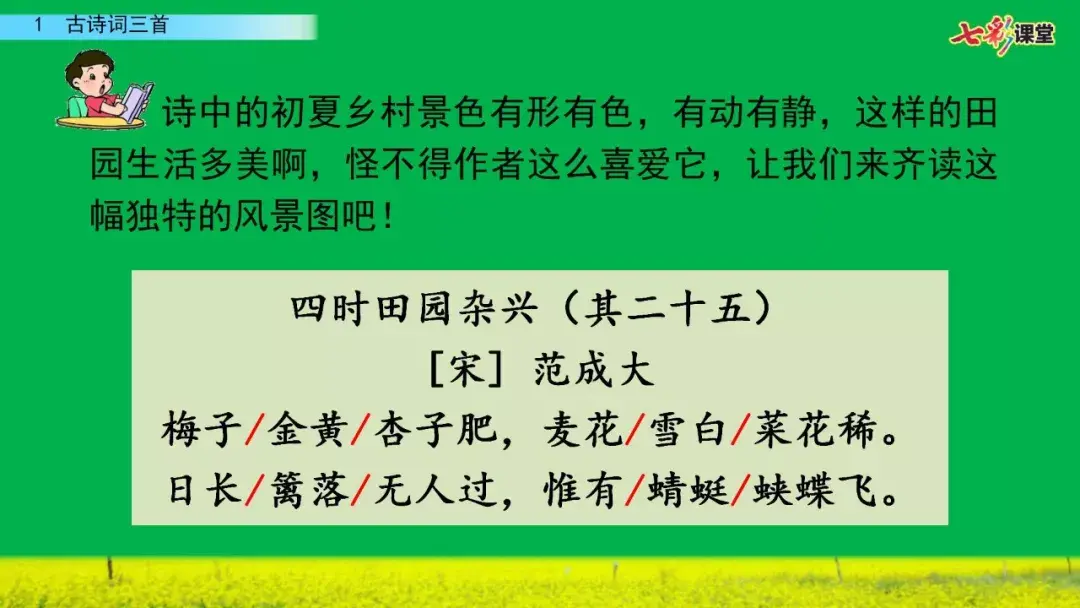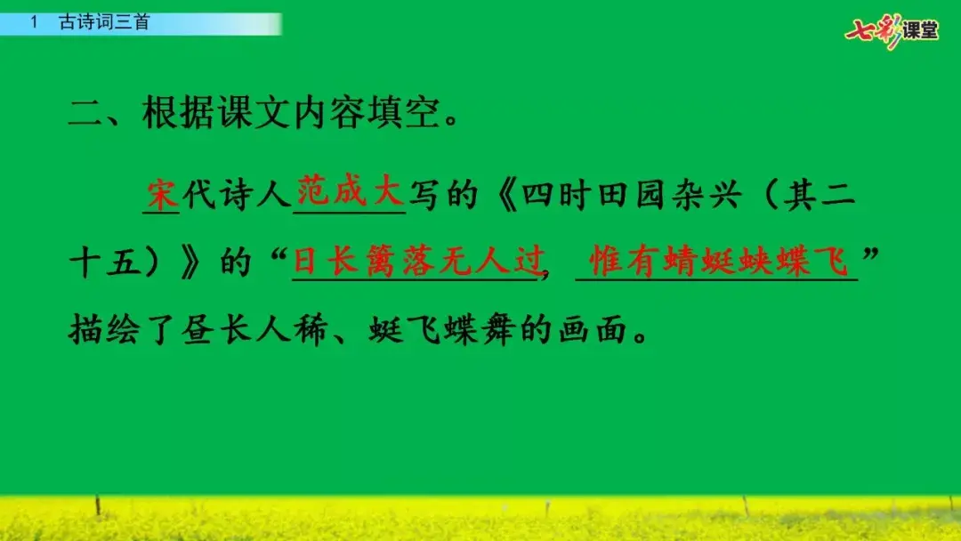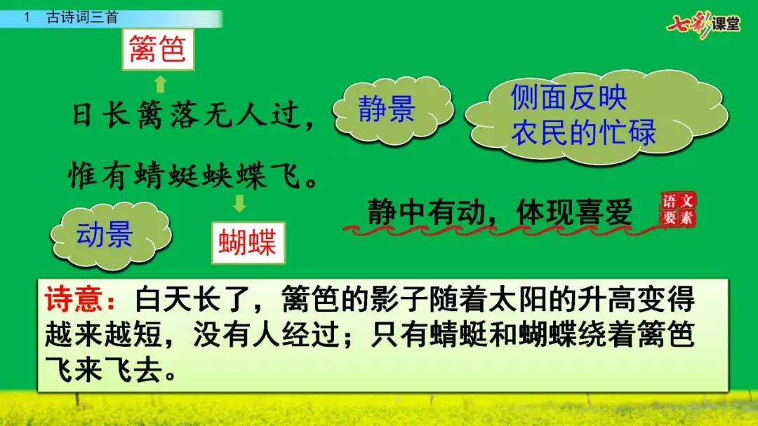 诗意:白天长了,农民忙着在地里干活,中午也不回家,篱笆的影子随着太阳的升高变得越来越短,门前没有人走动,只有蜻蜓和蝴蝶绕着篱笆飞来飞去。