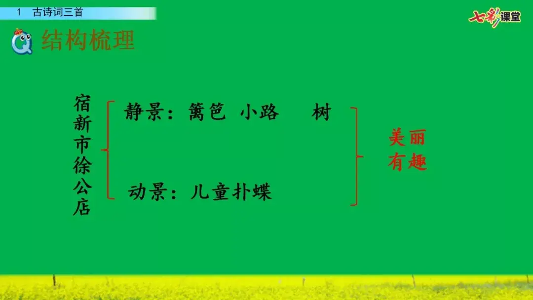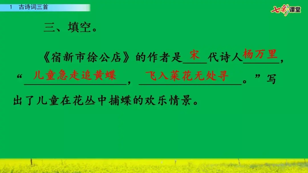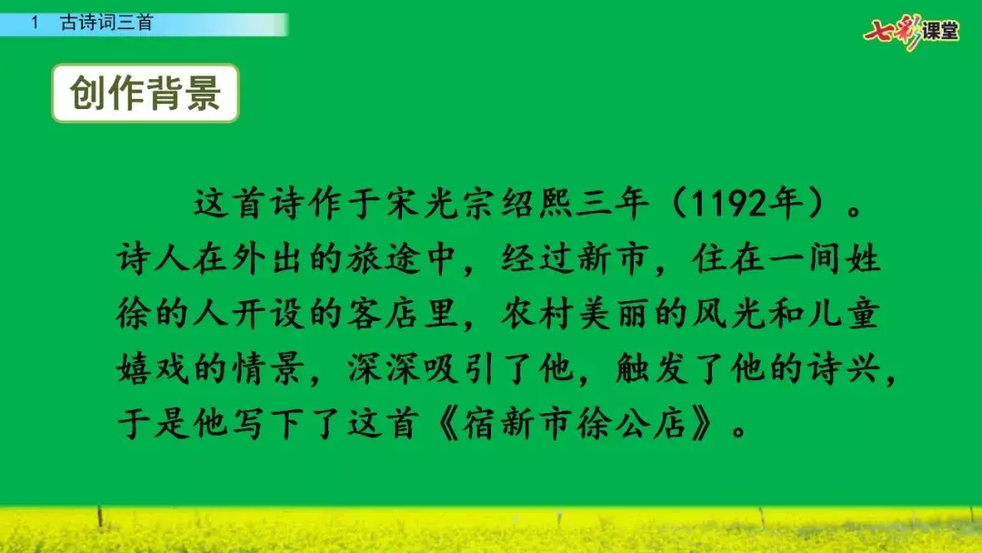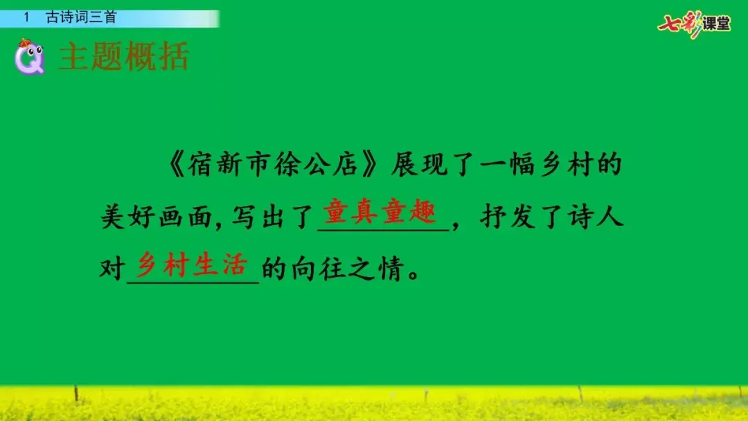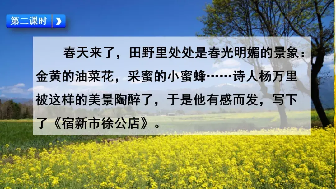 《宿新市徐公店》描写了清新美丽田园春光和儿童在菜花地边追逐黄蝶的生动画面。诗篇洋溢着浓烈的乡村生活情趣,表达了诗人对美丽田园春色的赞美和对乡村儿童的喜爱以脏话对乡村生活的向往之情。