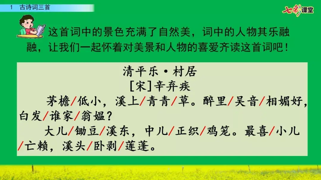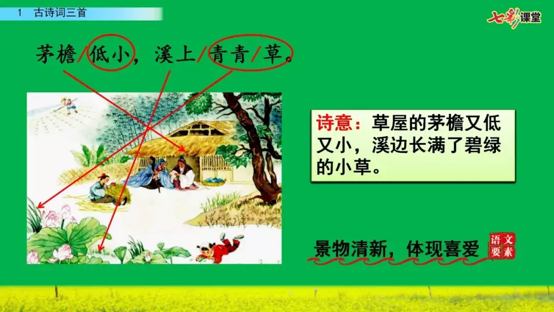 草屋的茅檐又低又小,溪边长满了碧绿的小草。含有醉意的吴地方言,听起来温柔又美好,那满头白发的老人是谁家的呀?大儿子在溪东边的豆田锄草,二儿子正忙于编织鸡笼。最令人喜爱的是小儿子,他正横卧在溪头草丛,剥着刚摘下的莲蓬。