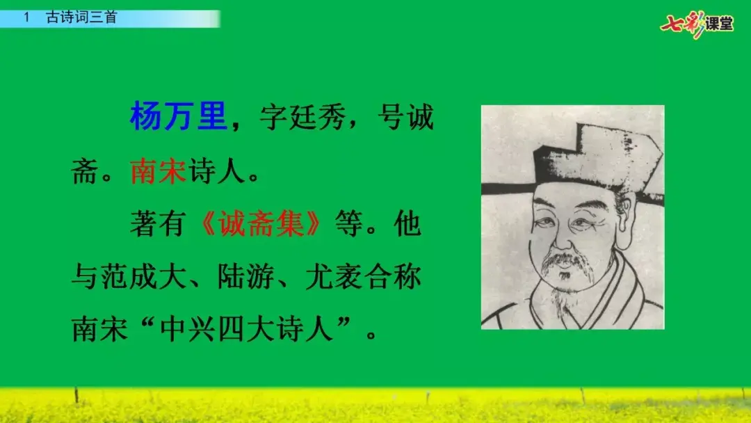 杨万里(1127年—1206年)字廷秀,号诚斋。南宋著名文学家、诗人。与陆游、尤袤、范成大并称“南宋四大家”(又作“中兴四大诗人”)。因宋光宗曾为其亲书“诚斋”二字,故学者称其为“诚斋先生”。主要作品:《小池》《晓出净慈寺送林子方》《舟过安仁》等。