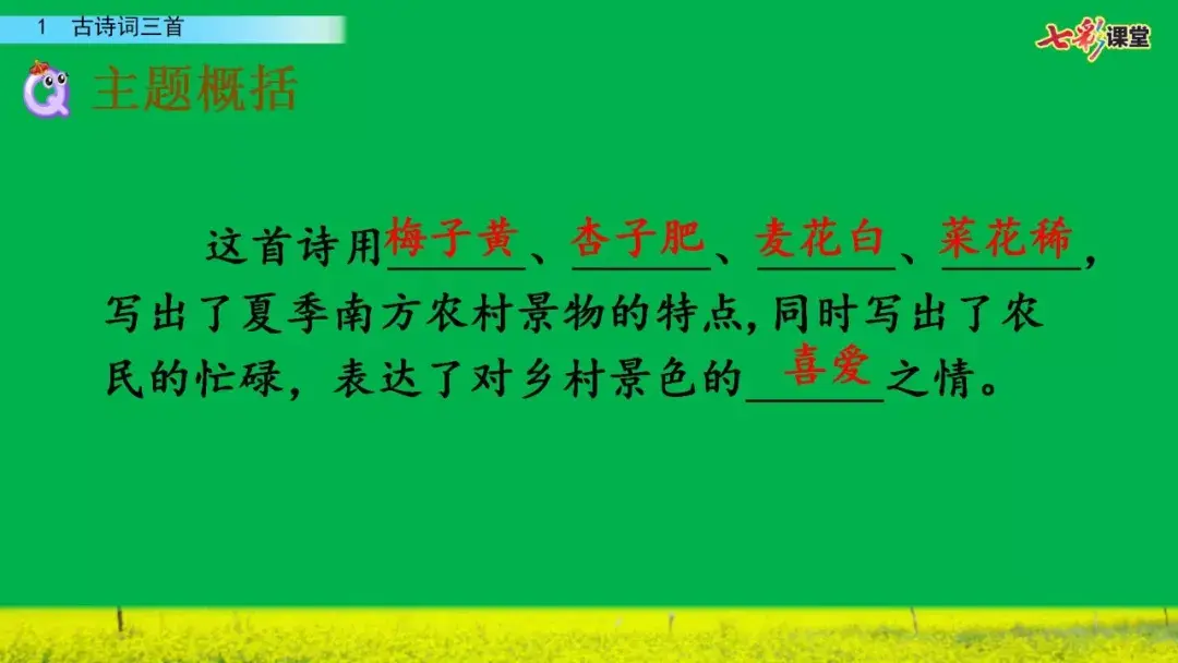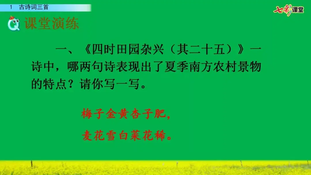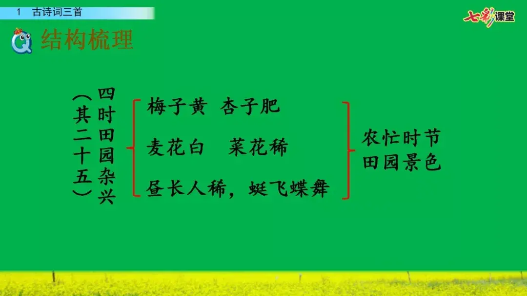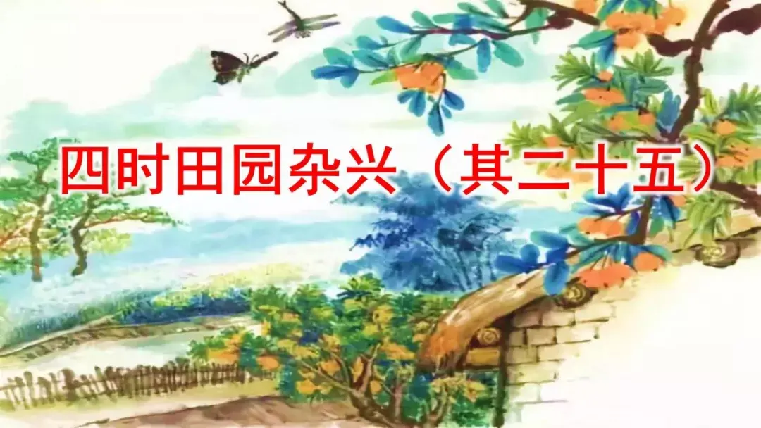 《四时田园杂兴(其二十五)》这首诗用梅子黄 杏子肥 麦花白 菜花稀等描写初夏农村的自然景色及农人紧张的劳动气氛,表现了诗人对田园风光的热爱之情。