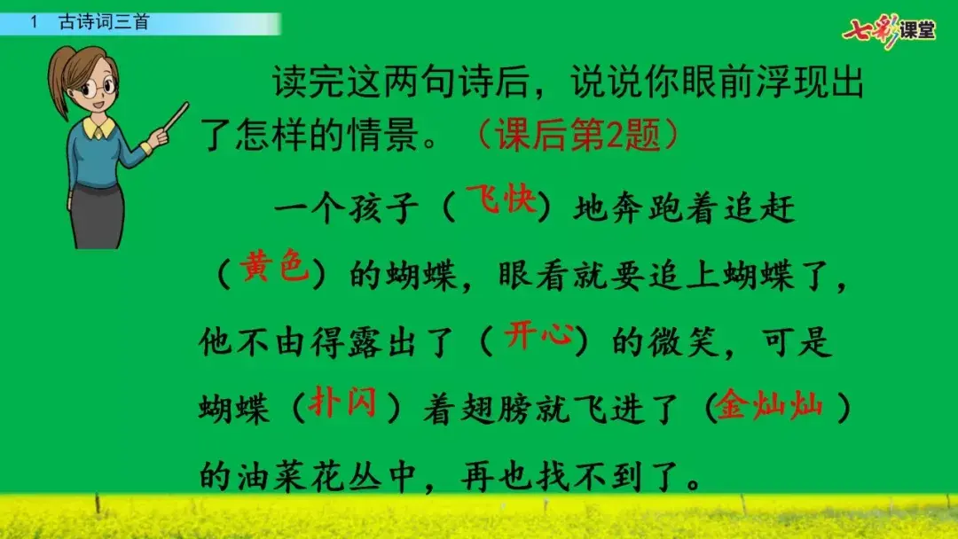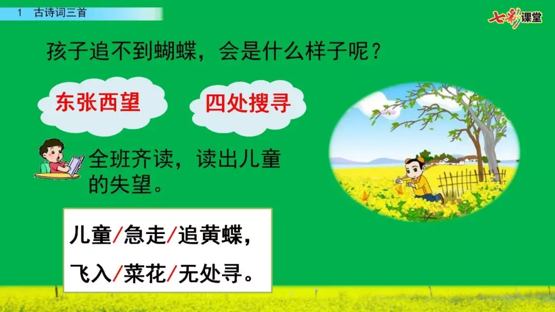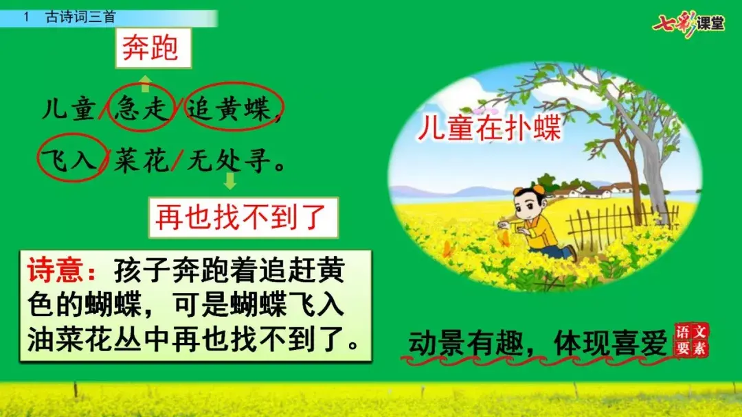 ②后两句描绘了儿童捕蝶时的欢乐场面。“急走”和“追”这两个动词,写出了儿童的天真烂漫,极富童趣。而黄蝶更加顽皮,它置身于黄色的菜花之中,让人无法找到。全诗至此戛然而止,给读者留下无穷的想象和回味的空间。