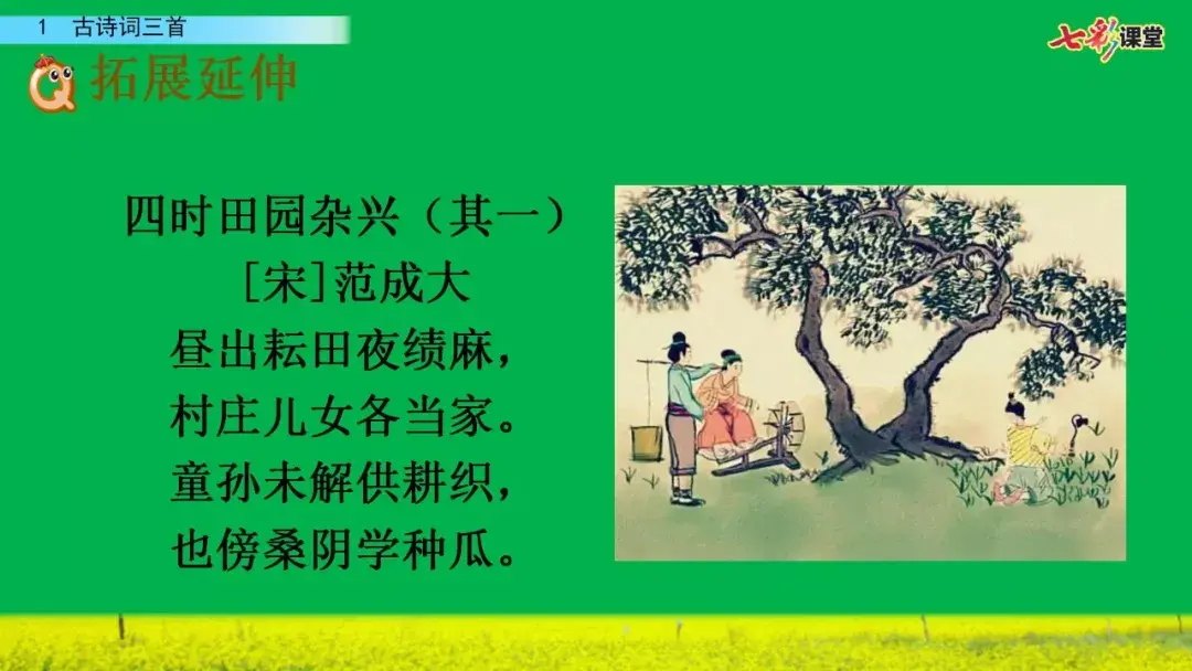 白天锄地,夜晚搓麻,农家男女都各司其事。小孩子不懂得种田织布之事,却也在桑树荫下学着大人的样子种瓜。