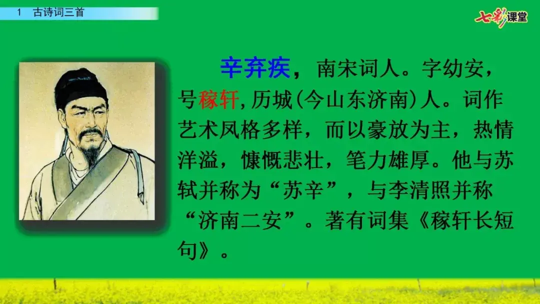主要作品:《青玉案·元夕》《菩萨蛮·书江西造口壁》《永遇乐·京口北固亭怀古》等。