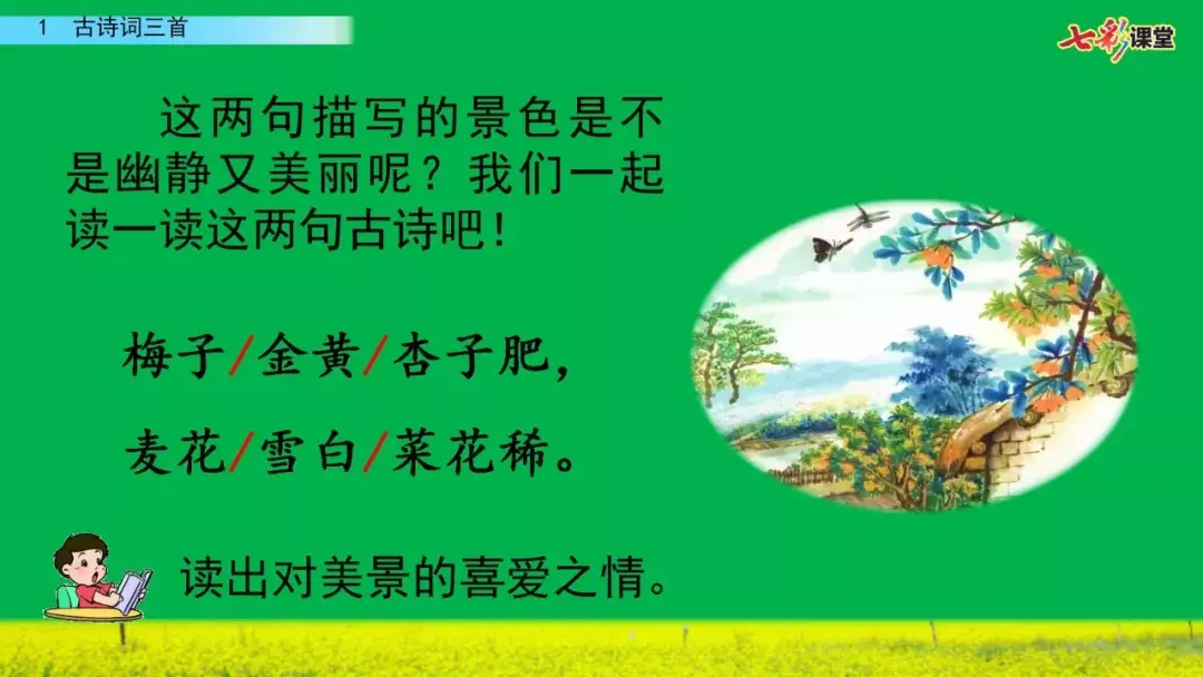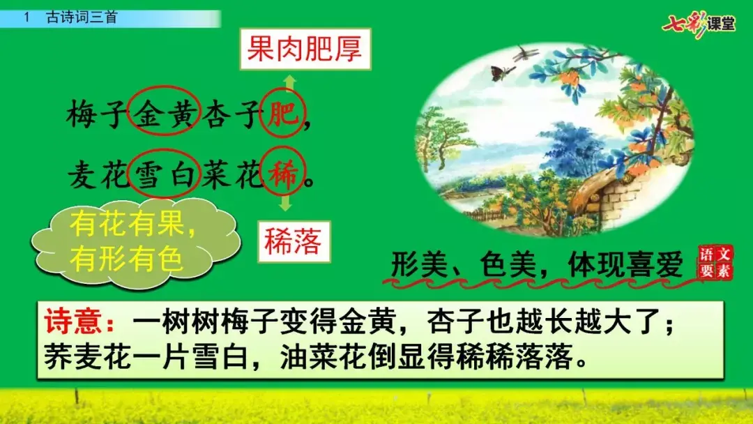 ①前两句诗用梅子黄、杏子肥、麦花白、菜花稀,突出了夏季南方农村景物的特点,有花有果,有色有形,色彩鲜丽,写出了田园之美。
