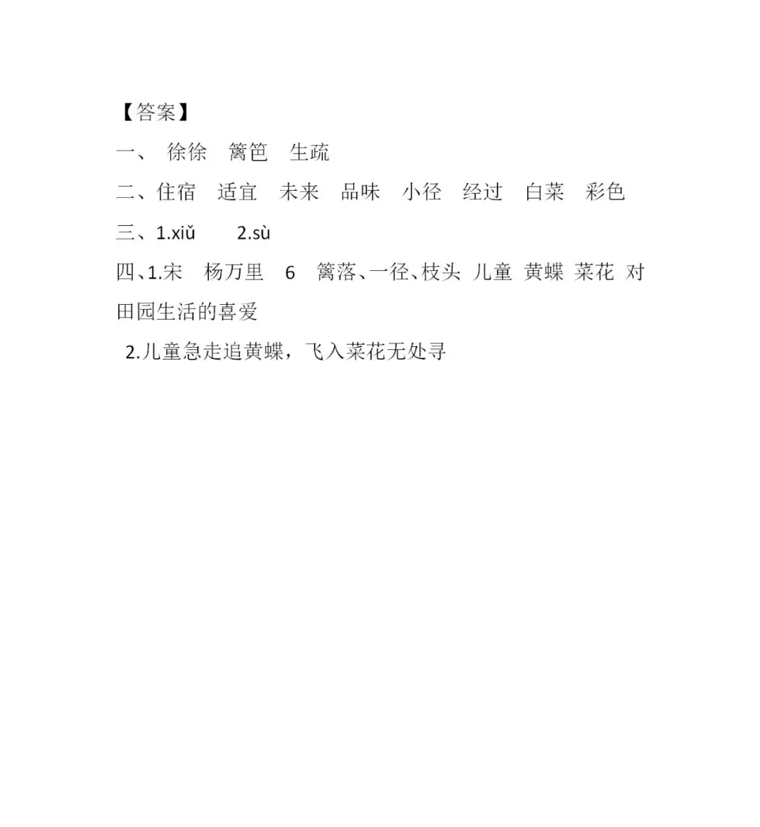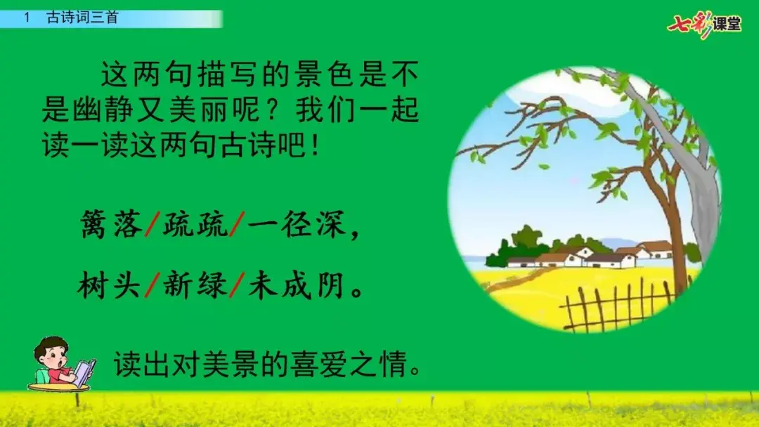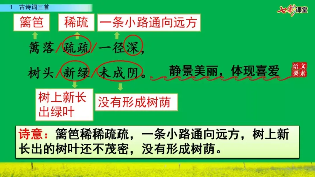 ①前两句是纯景物的静态描写。宽广的篱落与窄小的一径相对照,稀稀疏疏与绵绵长长相对照,互相映衬,突出了农村的清新与宁静。路旁,树叶刚刚长出,展示出农村自然、朴素的风貌。通过对春末夏初季节交替时景色的描写,展现了万物勃发的生命力。